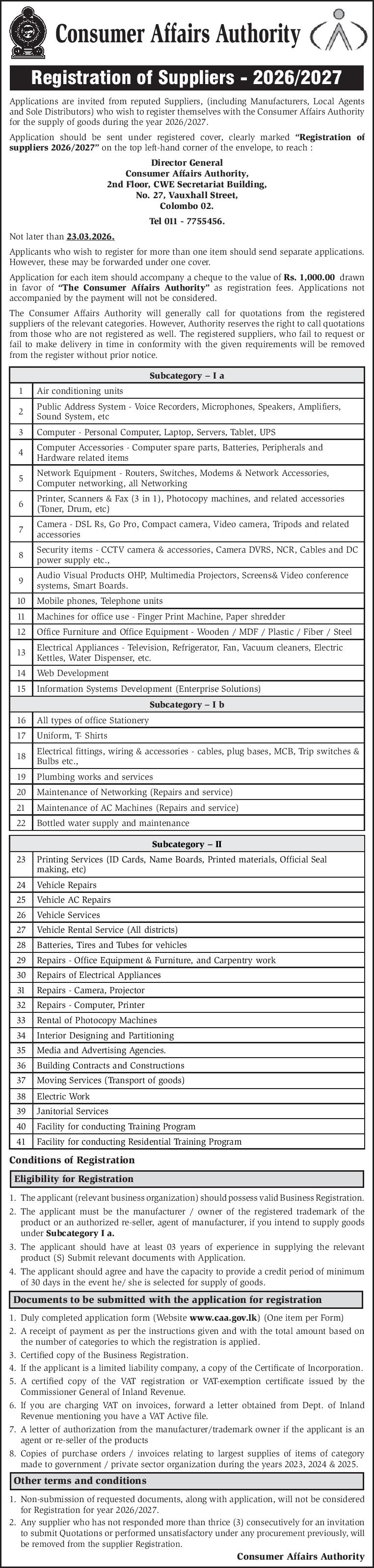 Registration of Suppliers 2026 2027 Closing Date of Submission 23-03-2026 Application Form