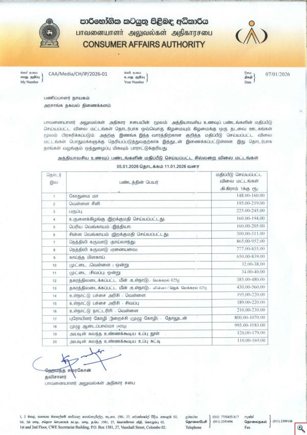 Indicative Prices of Selected Essential Food Commodities 07 January 2026